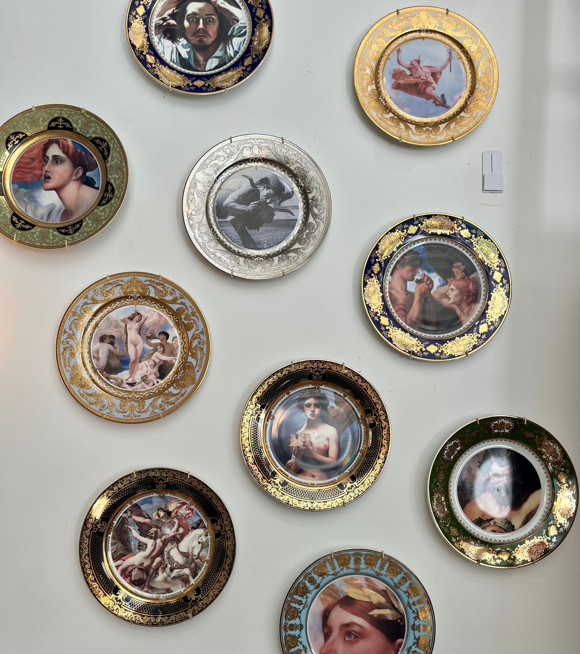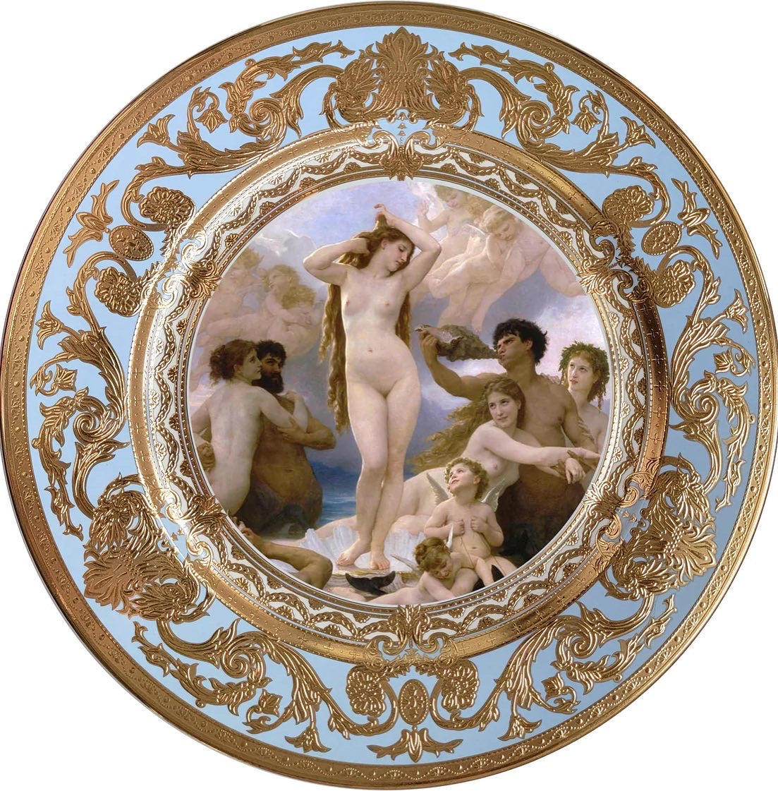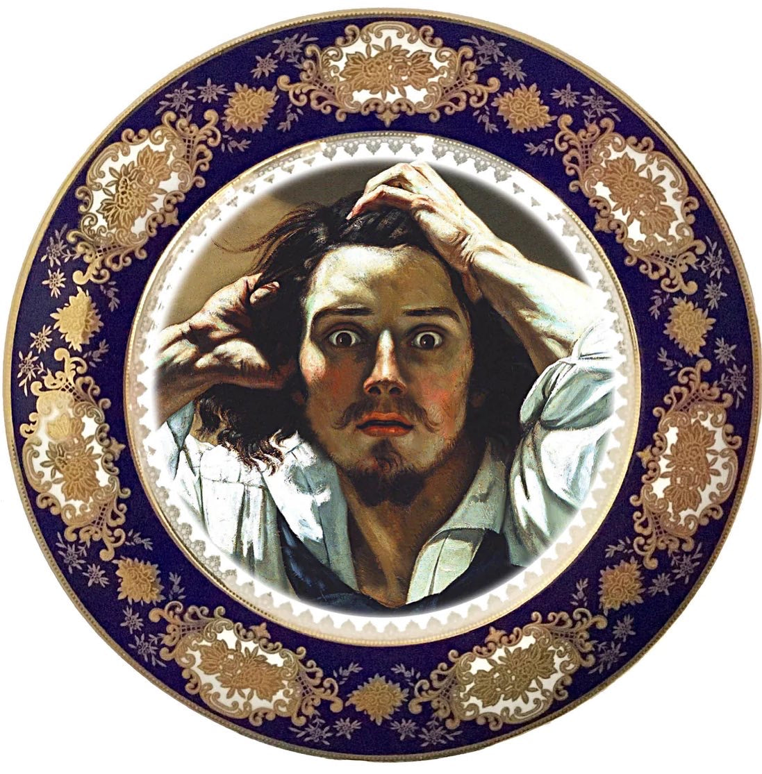 Classical paintings meet highly decorated porcelain plates in these stunning Art Plates, adding a touch of old-world charm and quirky humor to your home. Decorate your walls or table with these food-safe plates, though hand washing is recommended and microwaves should be avoided if plates have gold details. Dinner plates measure 10.5”.