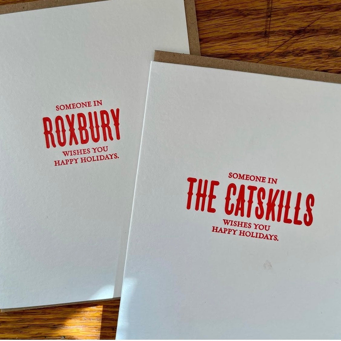 Celebrate the season with a touch of Catskills charm. These exclusive boxed sets of six letterpress cards features a playful holiday greeting that only locals—and those in the know—will truly appreciate. Each card opens to reveal the perfect punchline: "It's Me." Custom-made for Roxbury General and unavailable anywhere else, these beautifully printed letterpress cards bring warmth, humor, and a hint of mountain-town personality to your holiday wishes.