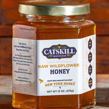 Catskill Provisions honey is raw and never heated, maintaining all of the antioxidants and amino acids that are lost in large-scale produced honey. Once you try raw, pure honey, you won’t have it any other way. 12 oz. in hexagonal glass jar (L 3", W 3", H 4").