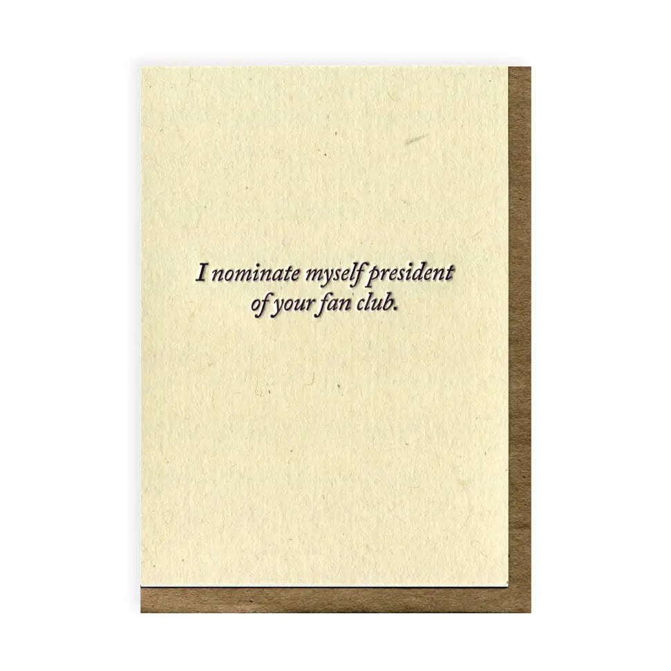"I nominate myself president of your fan club." is a sweet card of support for anyone in your life who needs it. Letterpress printed on recycled paper, 3.5" x 5", blank inside, individual card + envelope.