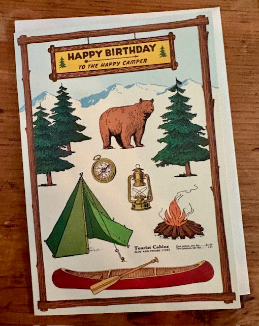 "Happy Birthday to the Happy Camper" Card with envelope, 3.5" x 5", blank inside.