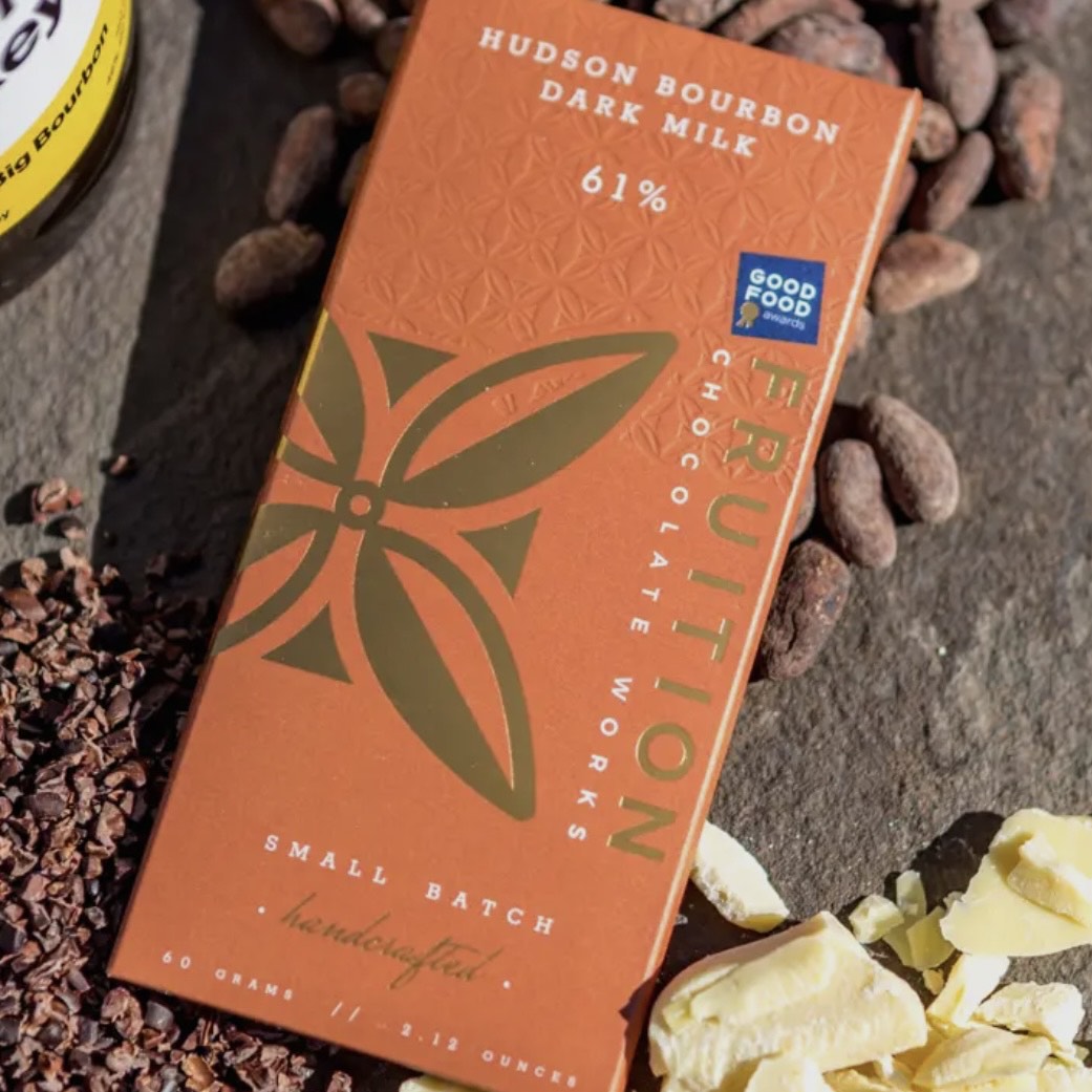 This award-winning bar is made from roasted cocoa nibs aged in bourbon barrels for three months and then crafted into a creamy dark milk chocolate with hints of oak and bourbon. 61% Cocoa. Made in the Catskills.