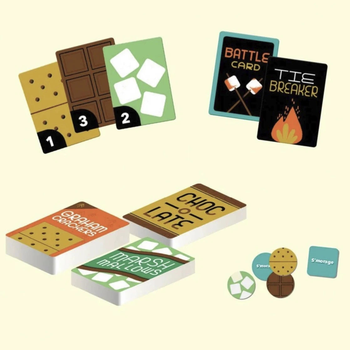 A sweet and sticky game for the whole family! S'mores Wars is a fast-paced, competitive, card-drafting game of cute food with a dark twist. In a race to collect the perfect s'more, you must sic marshmallows against your opponents' to squish, chomp, and toast them—before yours are smashed themselves! Ages 8+, 3–5 players, quick and easy to play and replay (games last 15–30 minutes). Contents: 25 Battle cards, 55 Ingredient cards, 20 round selection tokens, 5 Tiebreaker cards, and instructions.