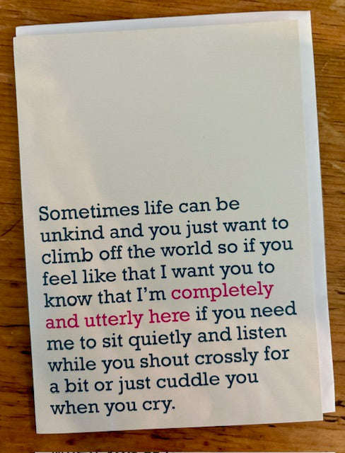 For anyone going through a tricky time: "Sometimes life can be unkind and you just want to climb off the world so if you feel like that I want you to know that I'm completely and utterly here if you need me to sit quietly and listen while you shout crossly for a bit or just cuddle you when you cry." Card with envelope, 5" x 7"