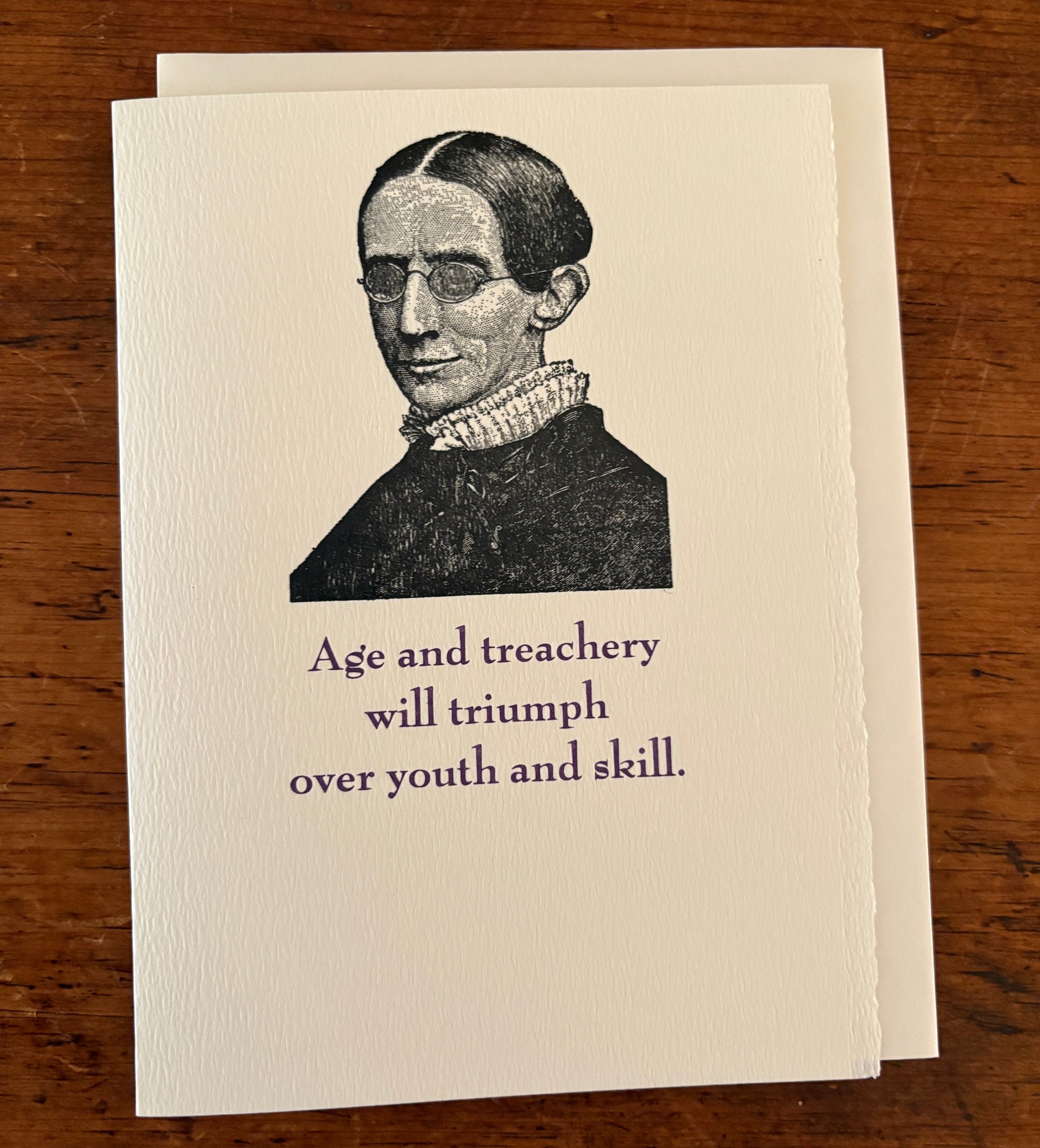 "Age and treachery will triumph over youth and skill." Blank inside for your own birthday or other message. Letterpress card + envelop, 5" x 7"